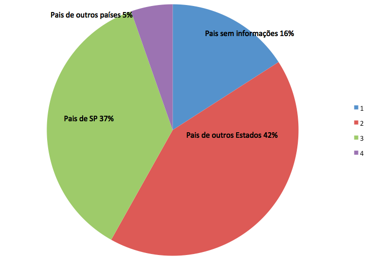 | TURMA | ALUNOS DE SP | PAIS DE SP | ALUNOS DE OUTROS ESTADOS DO BR | PAIS DE OUTROS ESTADOS DO BR | ALUNOS DE OUTROS PAISES | PAIS DE OUTROS PAISES | SEM INFORMAÇÃO SOBRE OS PAIS |