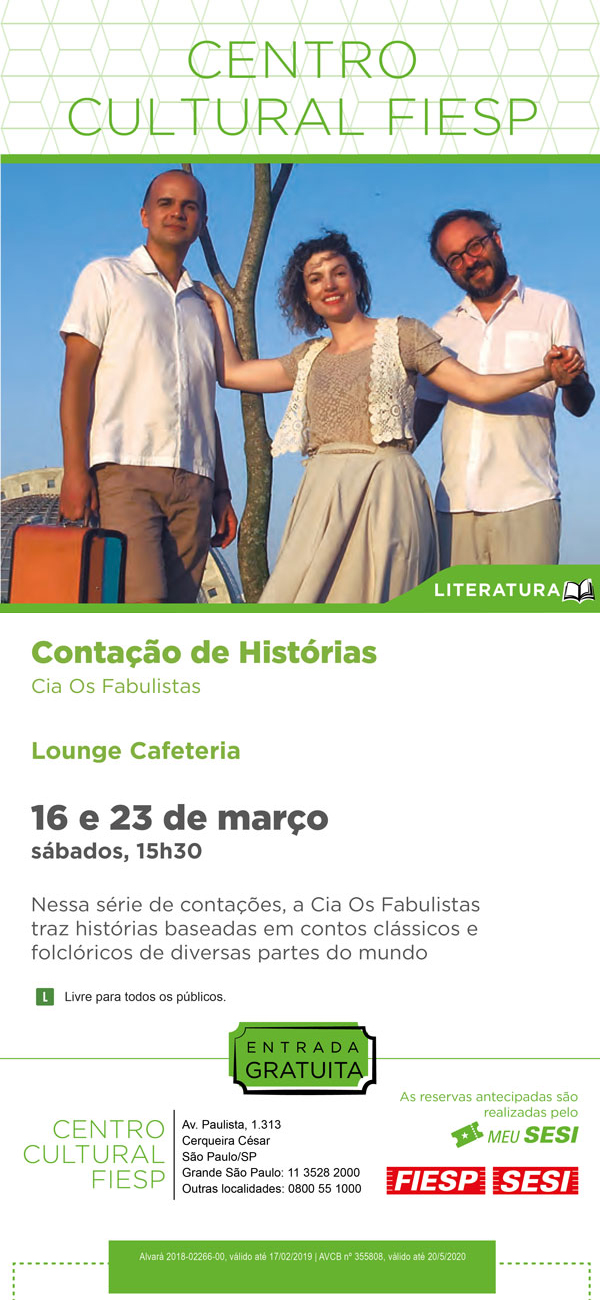 programação cultural, Território Contação de Histórias – Cia Os Fabulistas Publicado por EMEI ANA ROSA em 15 mar 2019 Dias 16 e 23 de Março, 15h30 – Centro Cultural FIESP Compartilhe isso: Clique para compartilhar no X(abre em nova janela) 18+ Clique para compartilhar no Facebook(abre em nova janela) Facebook Curtir Carregando... Relacionado