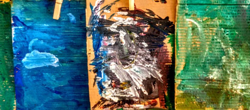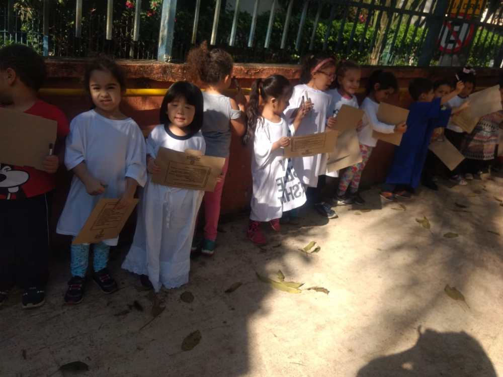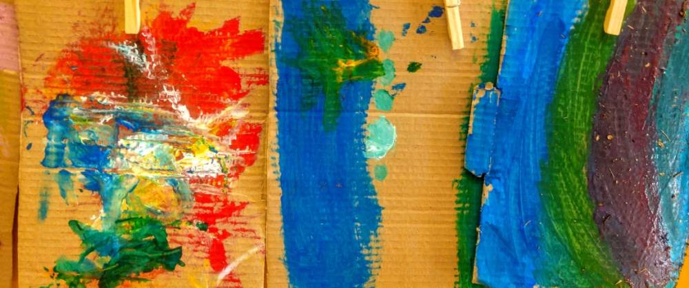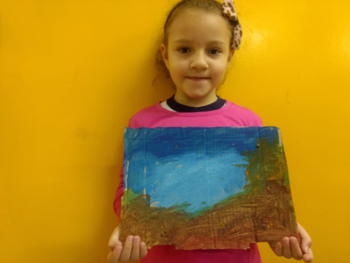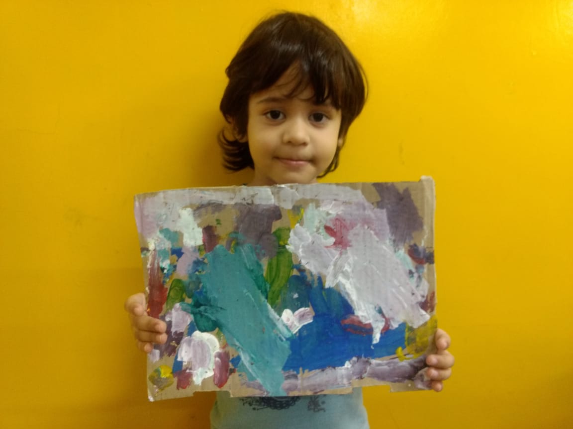 As crianças colocaram suas camisetas de artes, pegaram seus pincéis, tela de papelão e desceram bem animadas.