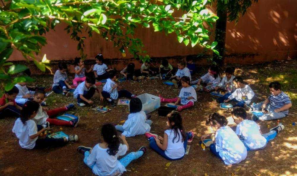 Durante o Projeto Artes compartilharmos alguns livrinhos de artes para crianças. E um deles foi do artista Van Gogh. Como nas suas pinturas tem muitas paisagens da natureza, as crianças pediram para pintar ao ar livre. Então elas colocaram seu traje artístico, pegaram sua tela de papelão e um pincel e lá foram bem animadas para realizarem um experiência diferente, num ambiente natural educativo…embaixo das árvores.