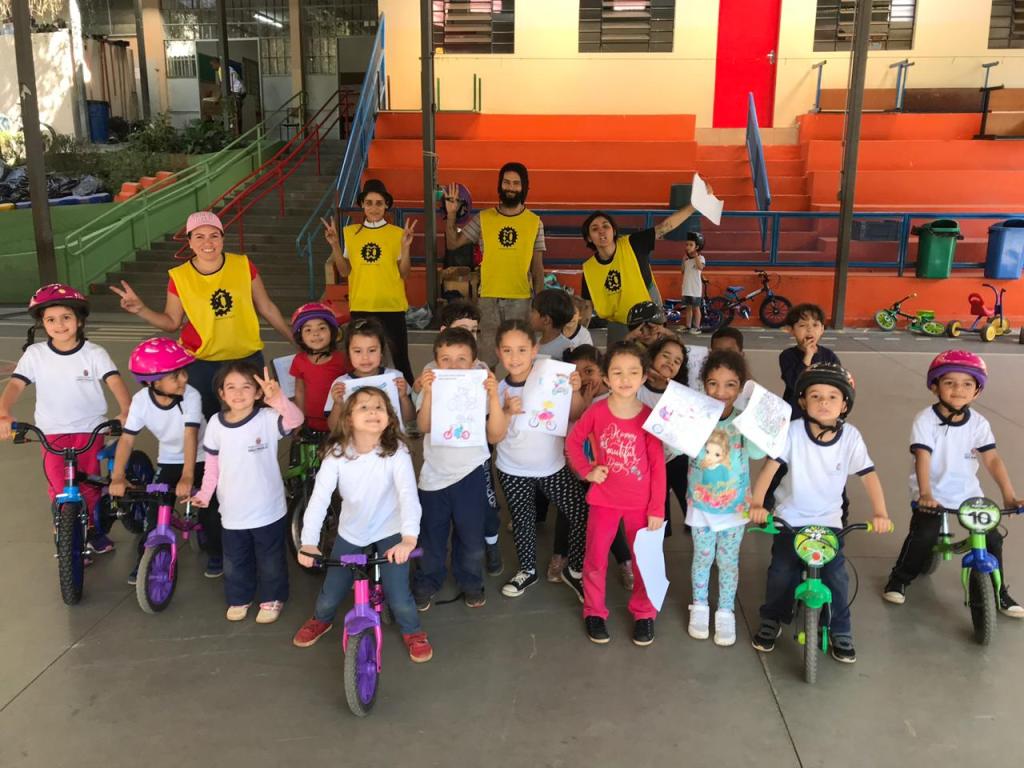 Convidamos a ONG ARO 60 para uma parceria, desenvolvendo com a escola, um projeto com crianças, famílias e território educativo. A primeira etapa foi realizar uma pesquisa com as famílias sobre a bicicleta como alternativa de deslocamento urbano e, em seguida, monitores da ARO 60 trouxeram bicicletas para a escola e ensinaram as crianças a pedalar sem rodinhas!