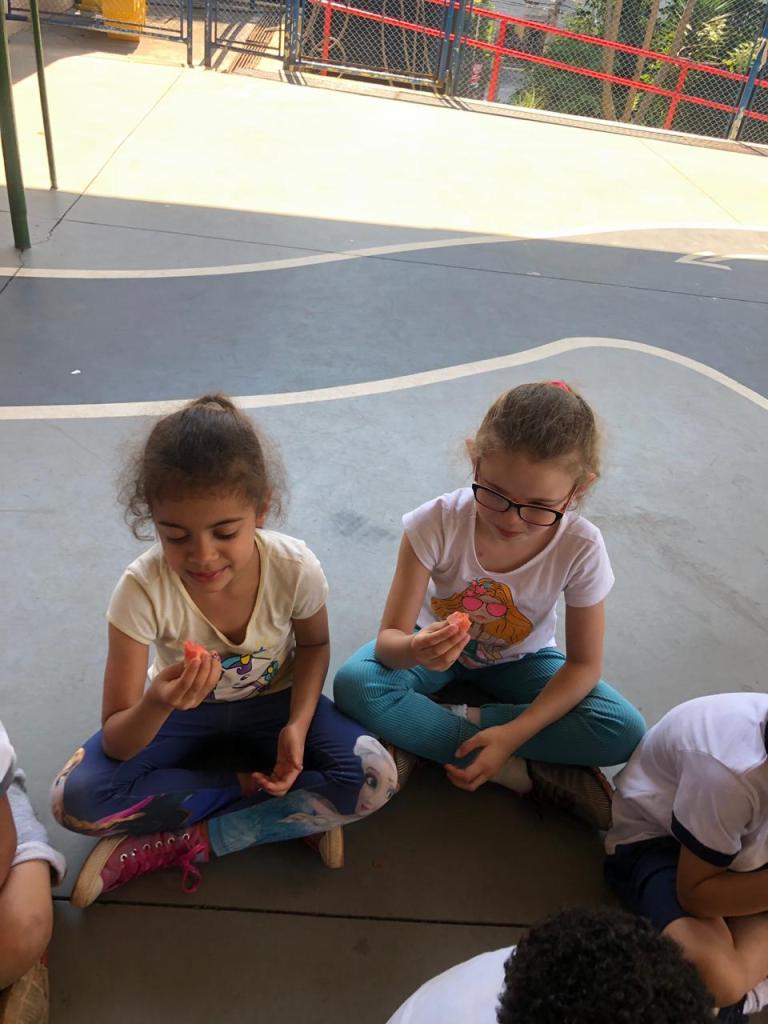 Além de sempre incentivarmos o consumo das frutas oferecidas nas refeições da escola, conversamos com as crianças sobre as vitaminas de cada fruta e procuramos despertar os sentidos, para que se sintam atraídos por suas cores, formas, texturas e sobretudo… sabores!