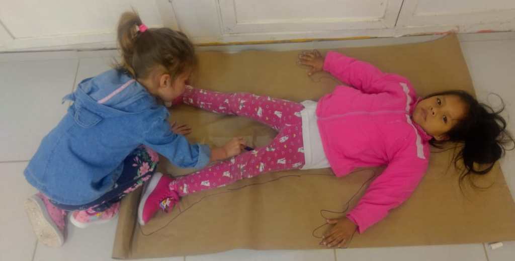 Em seguida, cada criança escolheu uma outra que tivesse a mesma altura para uma contornar o corpo da outra no papel pardo e foi uma diversão!