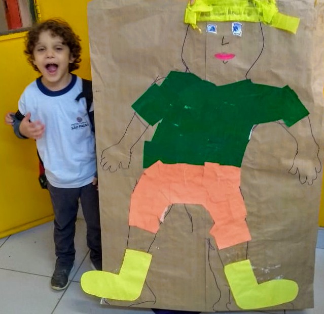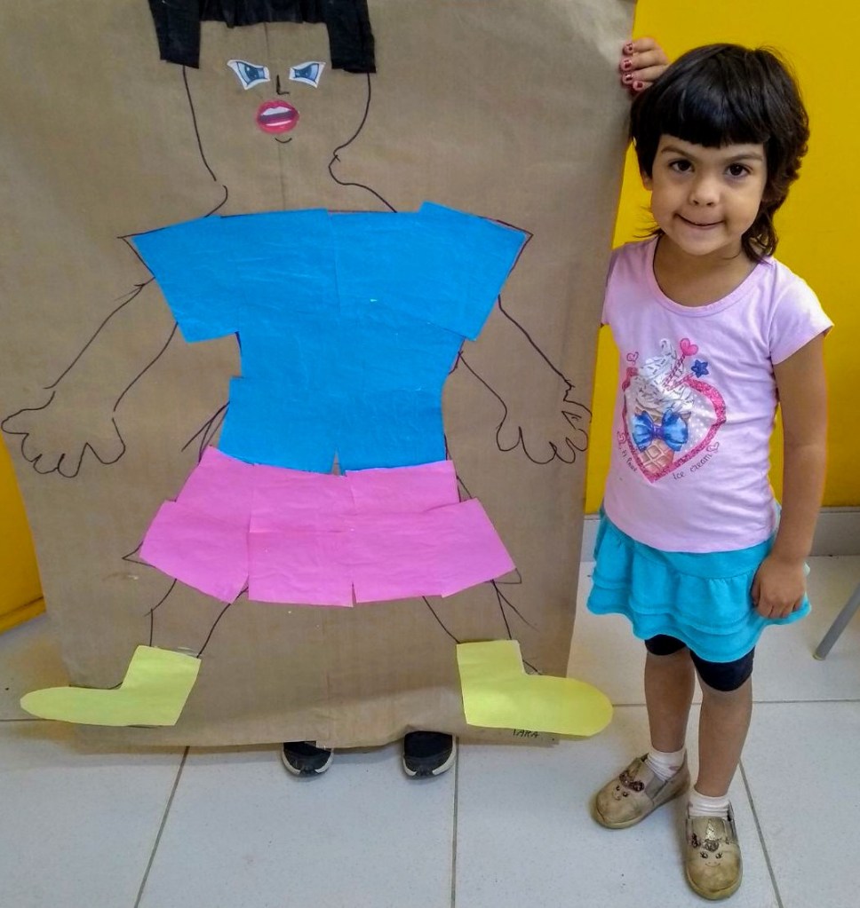 Continuando o projeto, colaram o cabelo e escolheram a roupa com pedaços de papéis coloridos e por fim, colaram os tênis.