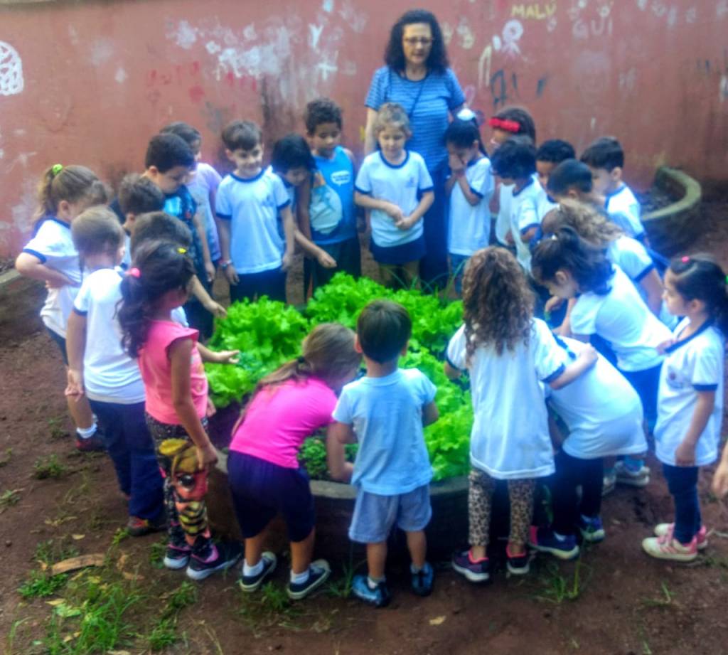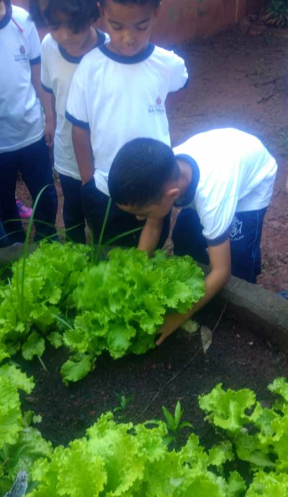 E essas crianças reagiram quando viram o canteiro repleto de alface. Alice, por exemplo, disse: – “Nossa gente, quanta alface! E como elas cresceram!” E o Kleber: – “Que demais as nossas alfaces!” O Arthur pulou de alegria e falou: “Deixa eu tirar da terra as alfaces, > professora, deixa!” A Valentina sorriu o tempo todo. O Gabriel Rosa também quis participar da colheita, mas comentou: “Eu nunca fiz isso, como que faz?”
