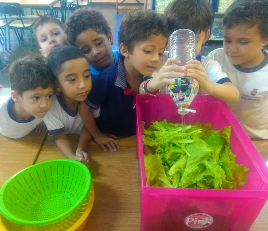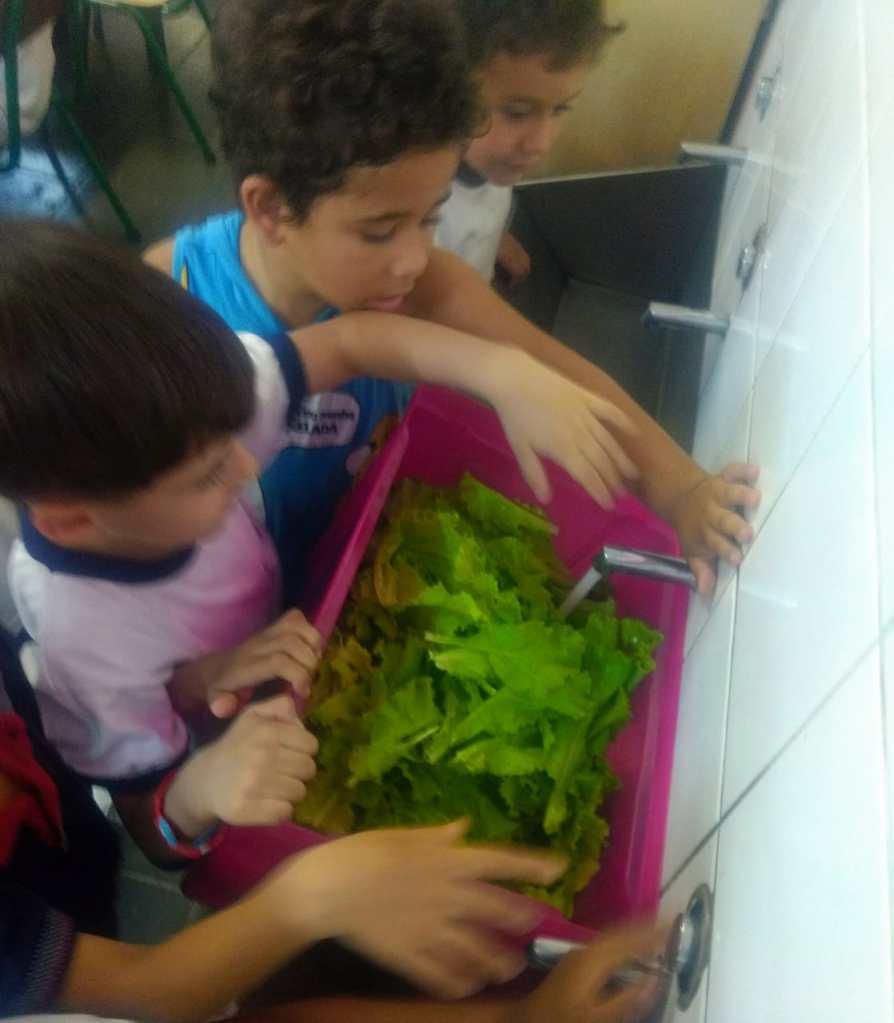 Então convidei a turma para irem ao refeitório para realizarem essa segunda etapa. Eu pude ver a animação de todas lavando cada folha.