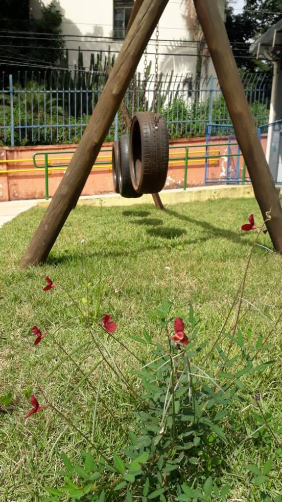 Como podem ver na foto, a grama que havia sido plantada cresceu e espera por todos para que nela pisem e venham se balançar, quando a pandemia passar!