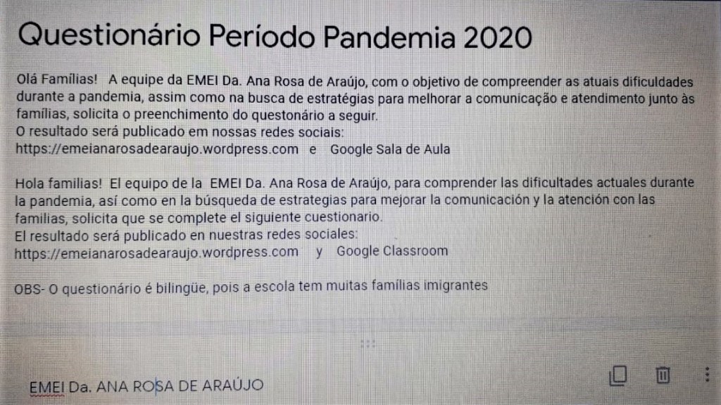 Considerando o atual momento de pandemia, suas consequências no ambiente escolar e a perspectiva de retorno às aulas (com data não definida até o momento), pedimos que preencham a pesquisa a seguir.