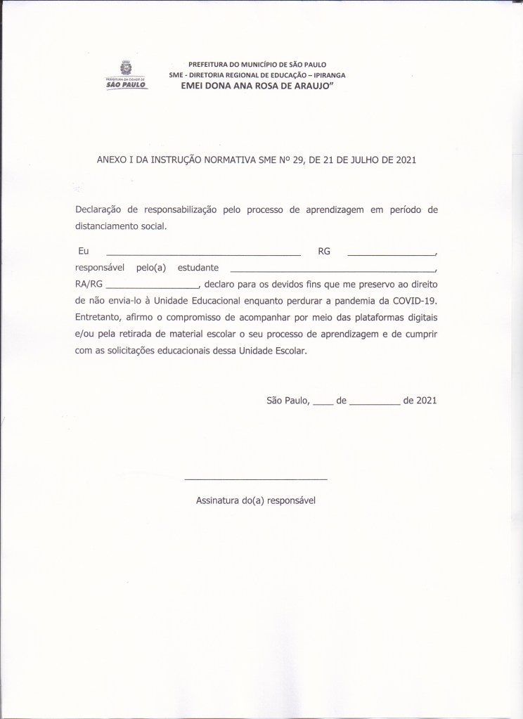 As famílias poderão ainda optar pela modalidade de ensino REMOTO, mediante assinatura do TERMO de RESPONSABILIDADE, onde declaram compromisso em realizar as atividades e publicar devolutivas na plataforma Google Sala de Aula.
