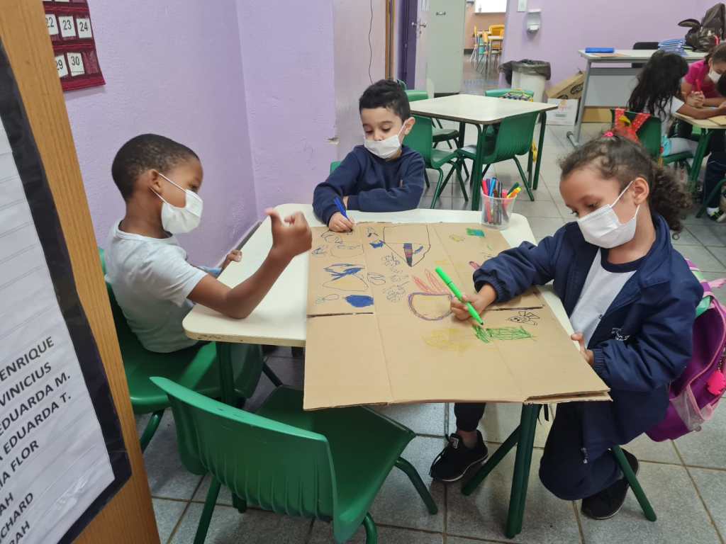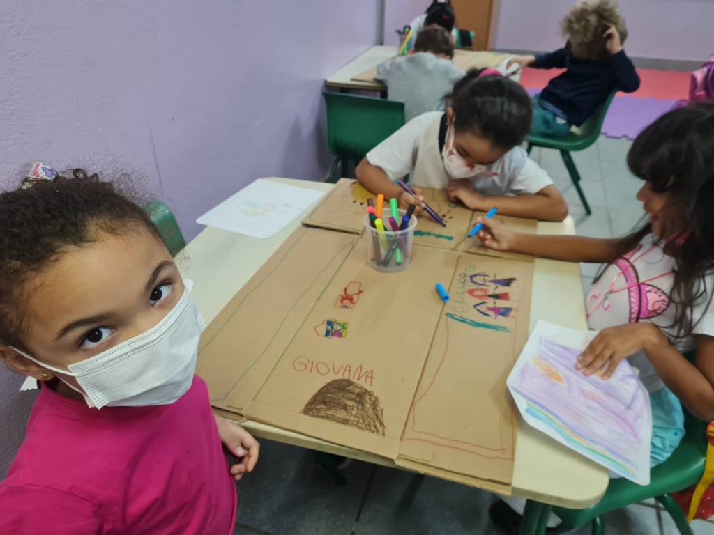 Numa roda de conversa sobre a história lida, as crianças disseram o que fariam com uma caixa de papelão e, em seguida, desenharam (projetaram) em papel sulfite suas próprias ideias!
