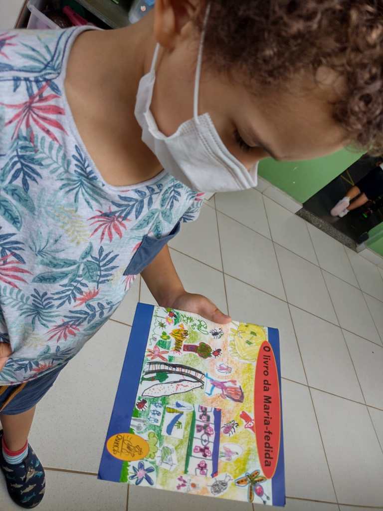 A professora achou um livro desenhado por crianças, que conta curiosidades sobre a Maria Fedida. Fizeram a leitura e uma roda de conversa sobre o inseto, que não é prejudicial para os seres humanos, a menos que tivéssemos uma plantação de soja…