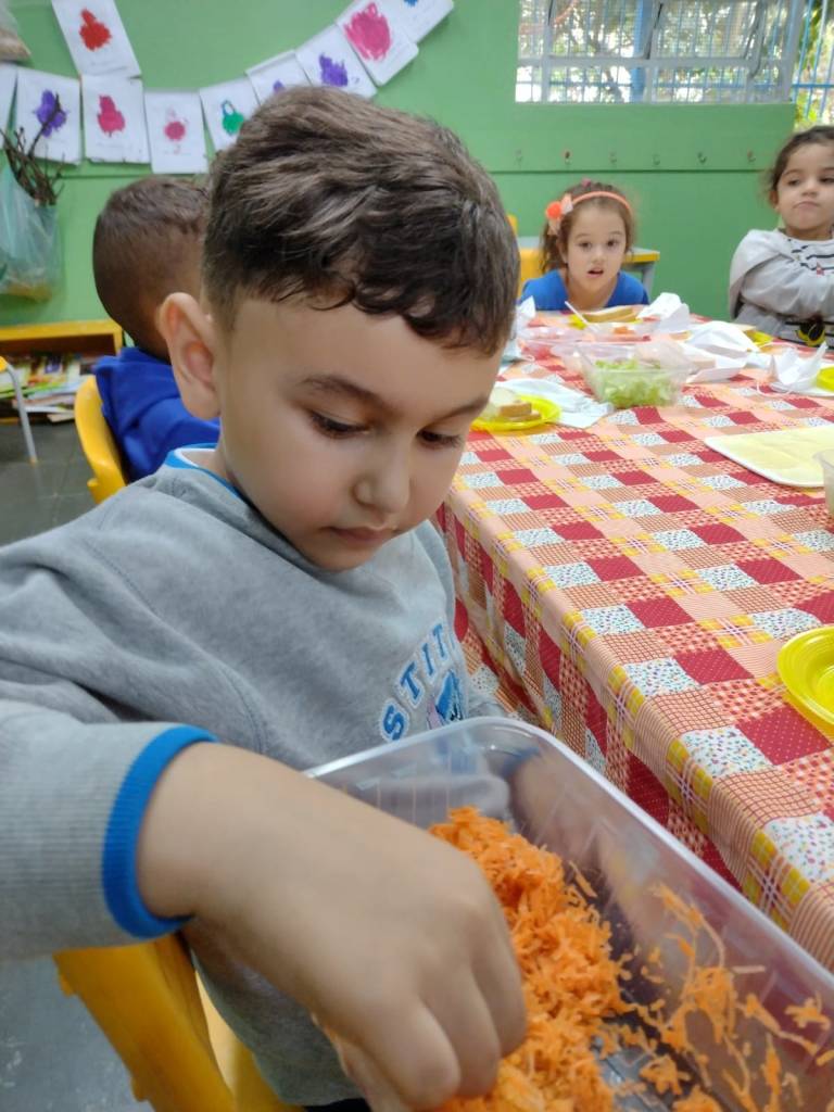 Iniciaram com a leitura do livro “O sanduiche da Maricota”, de autoria de Avelino Guedes, em que a galinha Maricota recebe muitos amigos e colaboradores para este momento especial de partilha: um lanche!