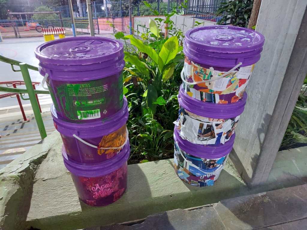 Com baldes doados por uma lanchonete da região, construimos composteiras domésticas e as crianças as decoraram: