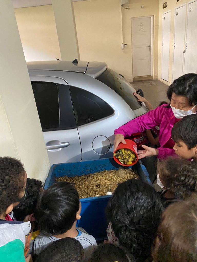 Seremos os únicos que realizam compostagem? NÃO! Descobrimos que nossos vizinhos do edifício em frente à escola também pratica compostagem e resolvemos fazer uma visita. Fomos muito carinhosamente recepcionados pela moradora Da. Norma que nos mostrou dois outros tipos de composteiras: um minhocário e uma composteira externa.