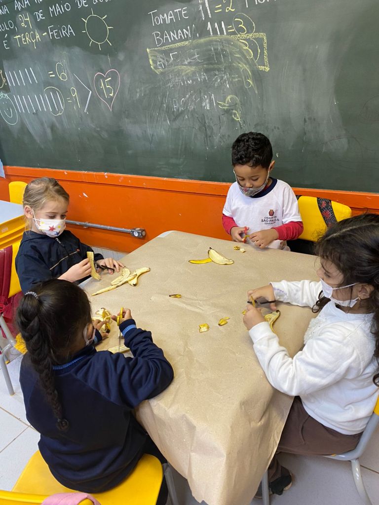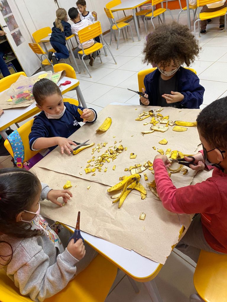 Além disso, cortar a casca de banana é uma brincadeira muito agradável, com diferente textura: