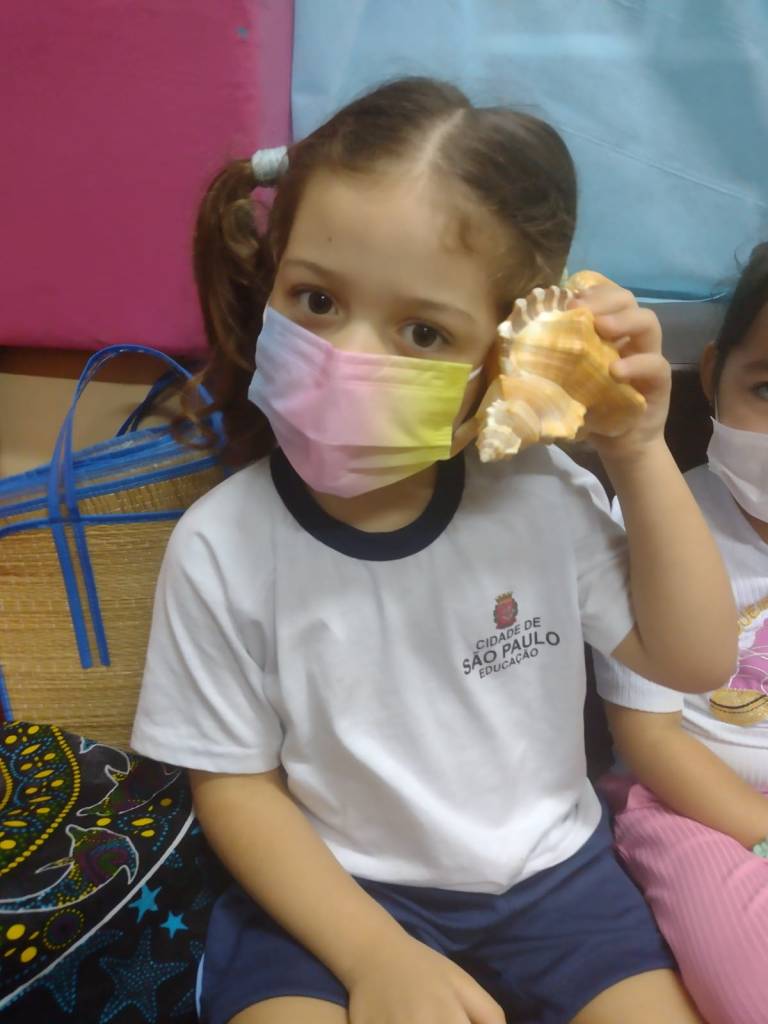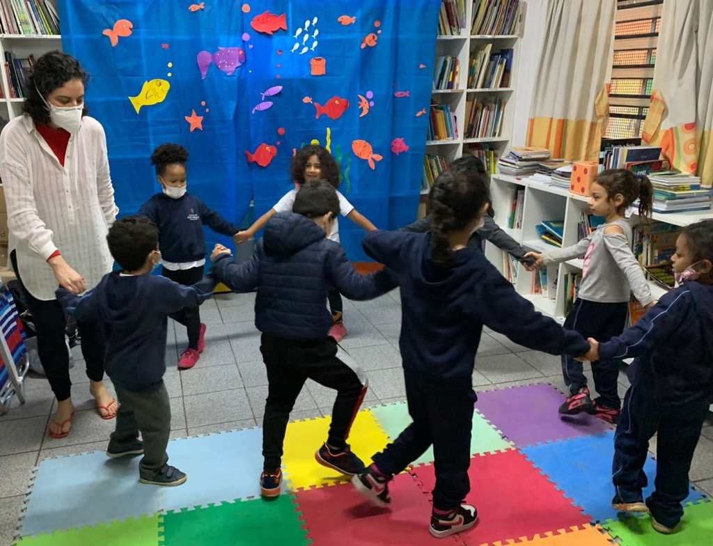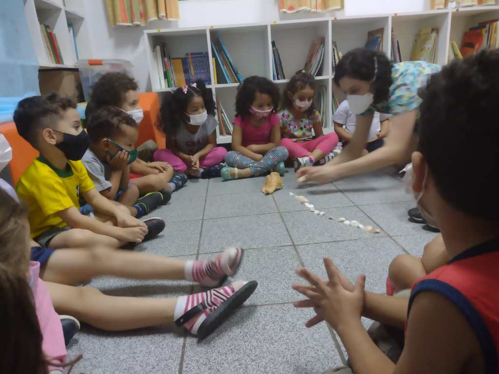 Na oficina, cantar e dançar em roda a cantiga “Caranguejo não é peixe” foi uma boa brincadeira, cheia de expressividade!